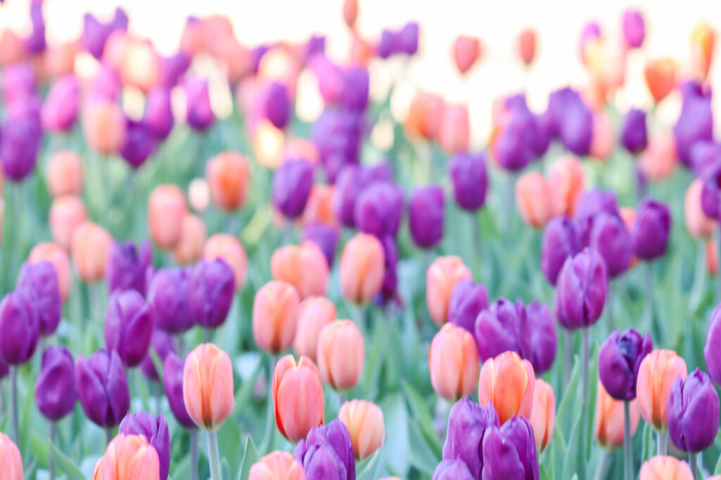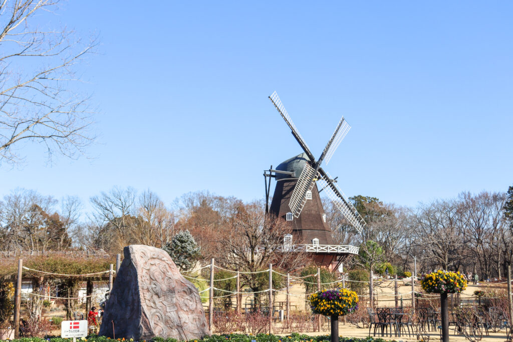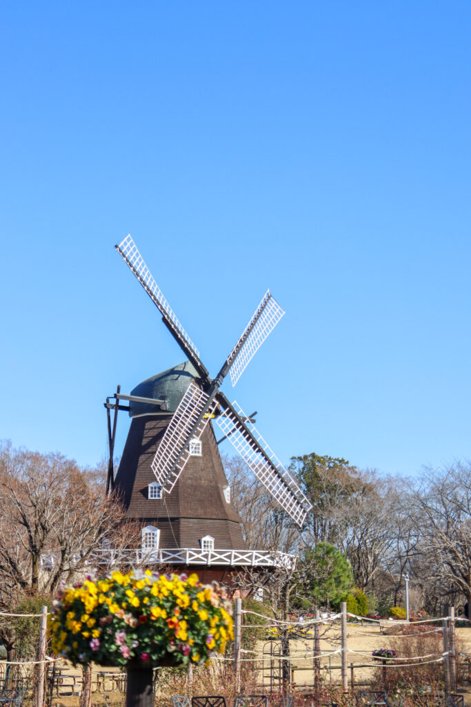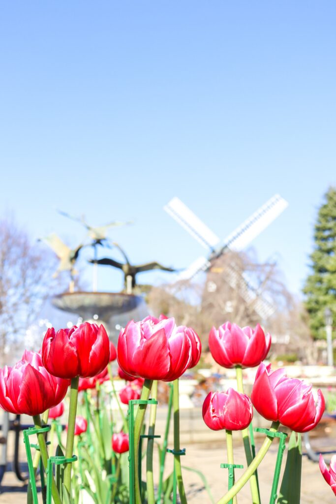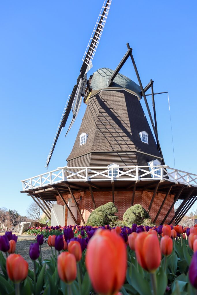風車の下には紫と赤の鮮やかなチューリップが咲いています。