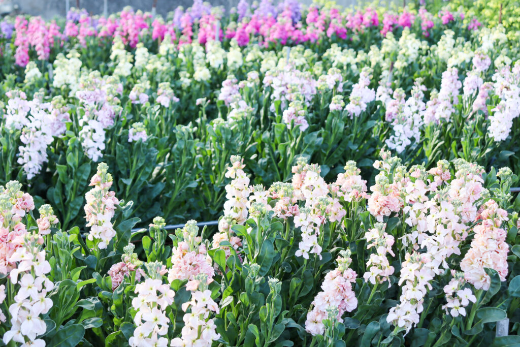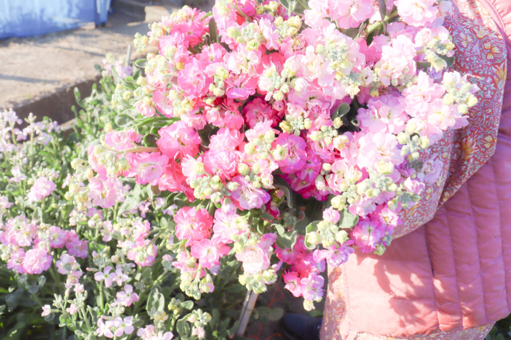 摘み取ったストックの花束を