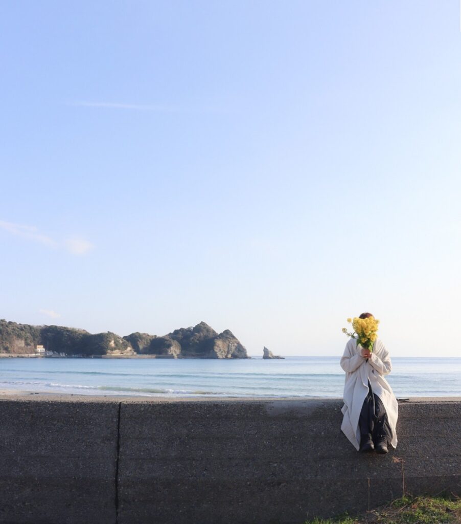 鵜原海岸の塀に腰掛けて