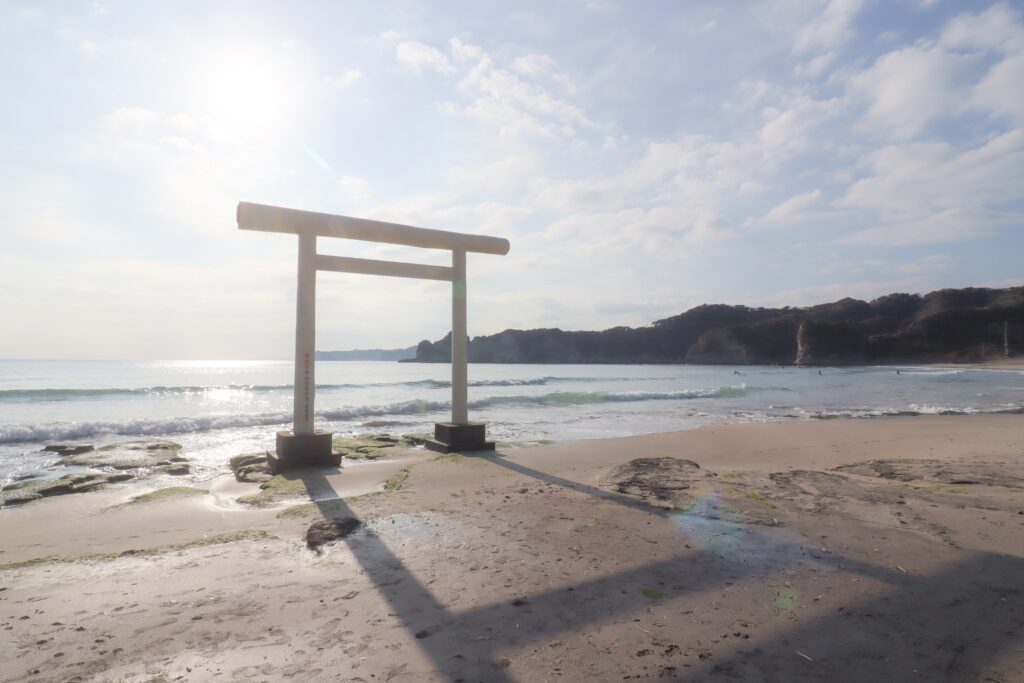 青い海に白い鳥居がとても映えますね。