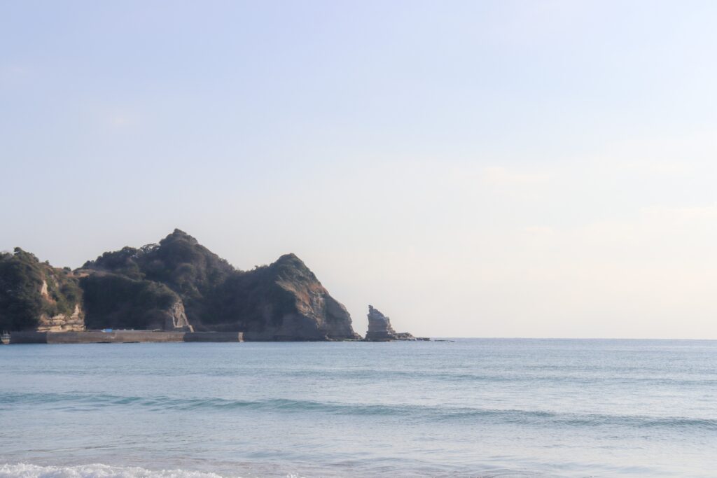 沖の方に見えるロウソクのような形の岩、