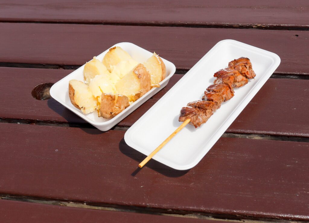 じゃがバターとシカ肉の串焼きを購入。