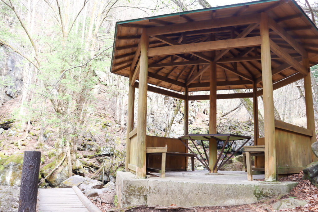 滝は、こちらの東屋の奥にあります。
