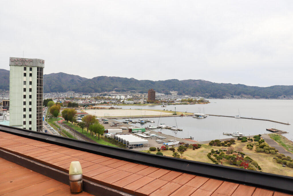 屋上の展望テラスからは諏訪湖を一望。