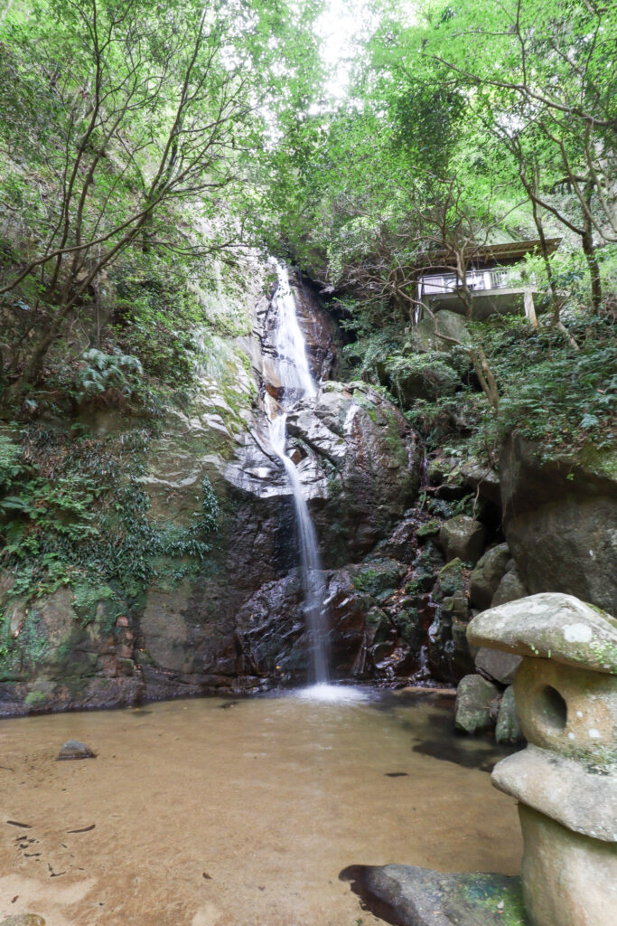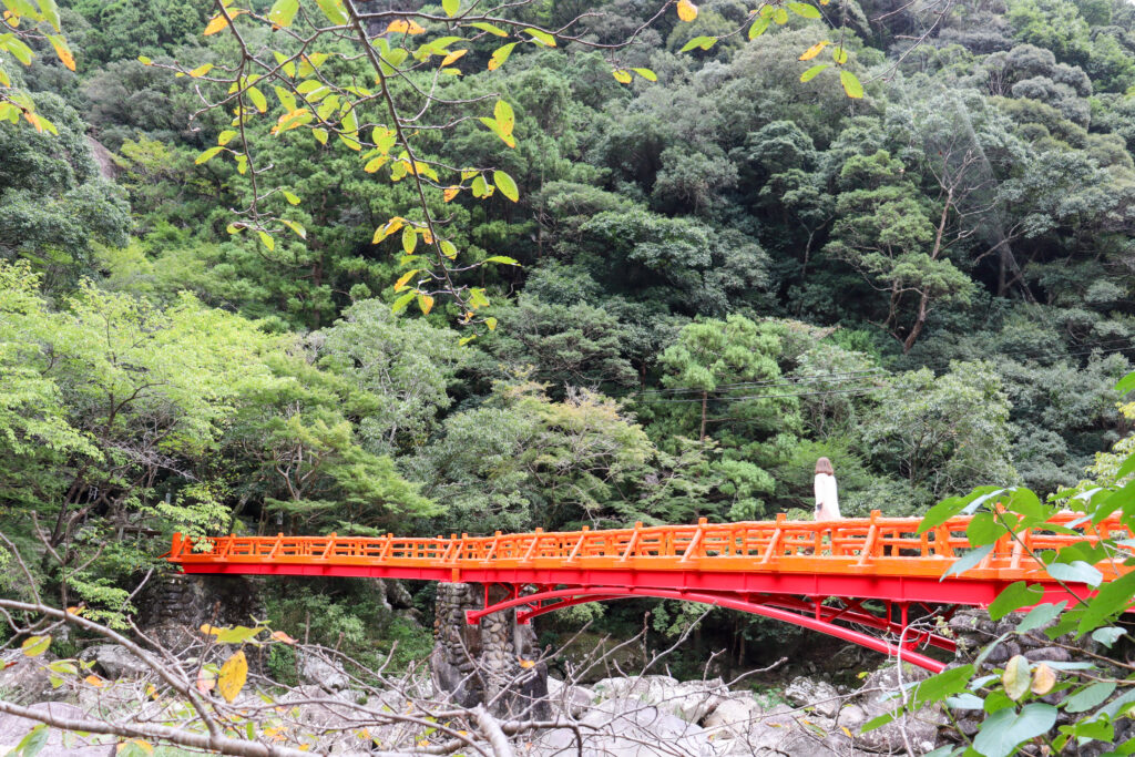 写真の赤い橋「滝見橋」の先には「不動の滝」が、