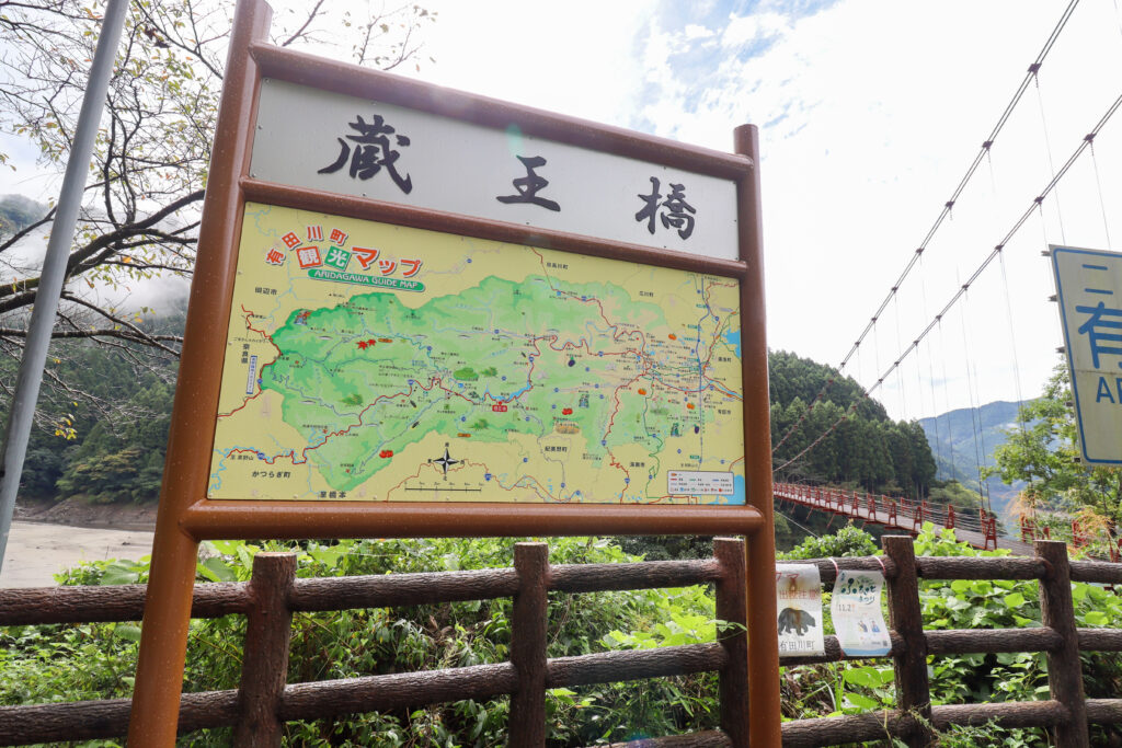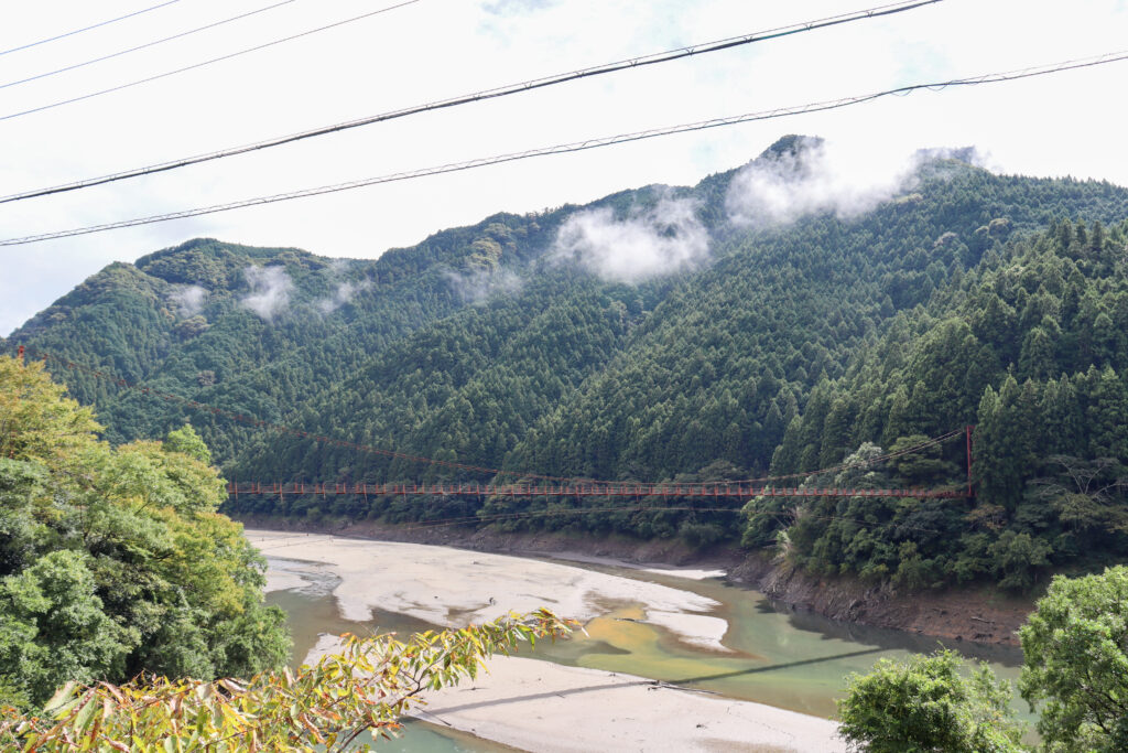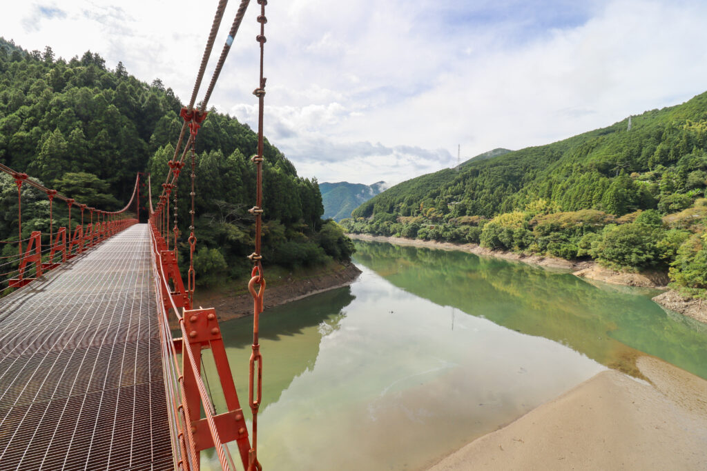二川ダム上に架かる赤い吊り橋・蔵王橋。
