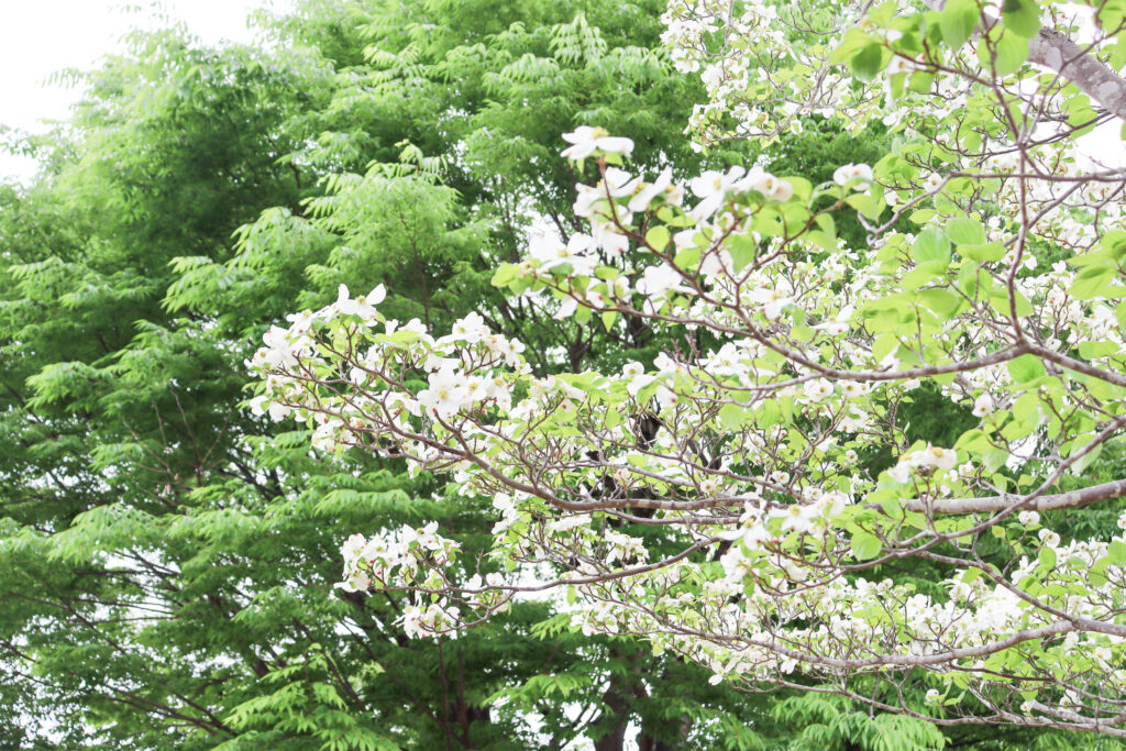 風にザワザワと揺れる新緑とハナミズキもきれい。