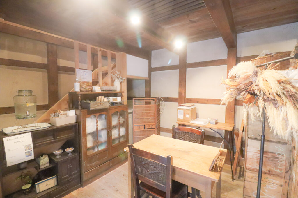 立派な梁が現しになった古民家?蔵かな?の空間に
